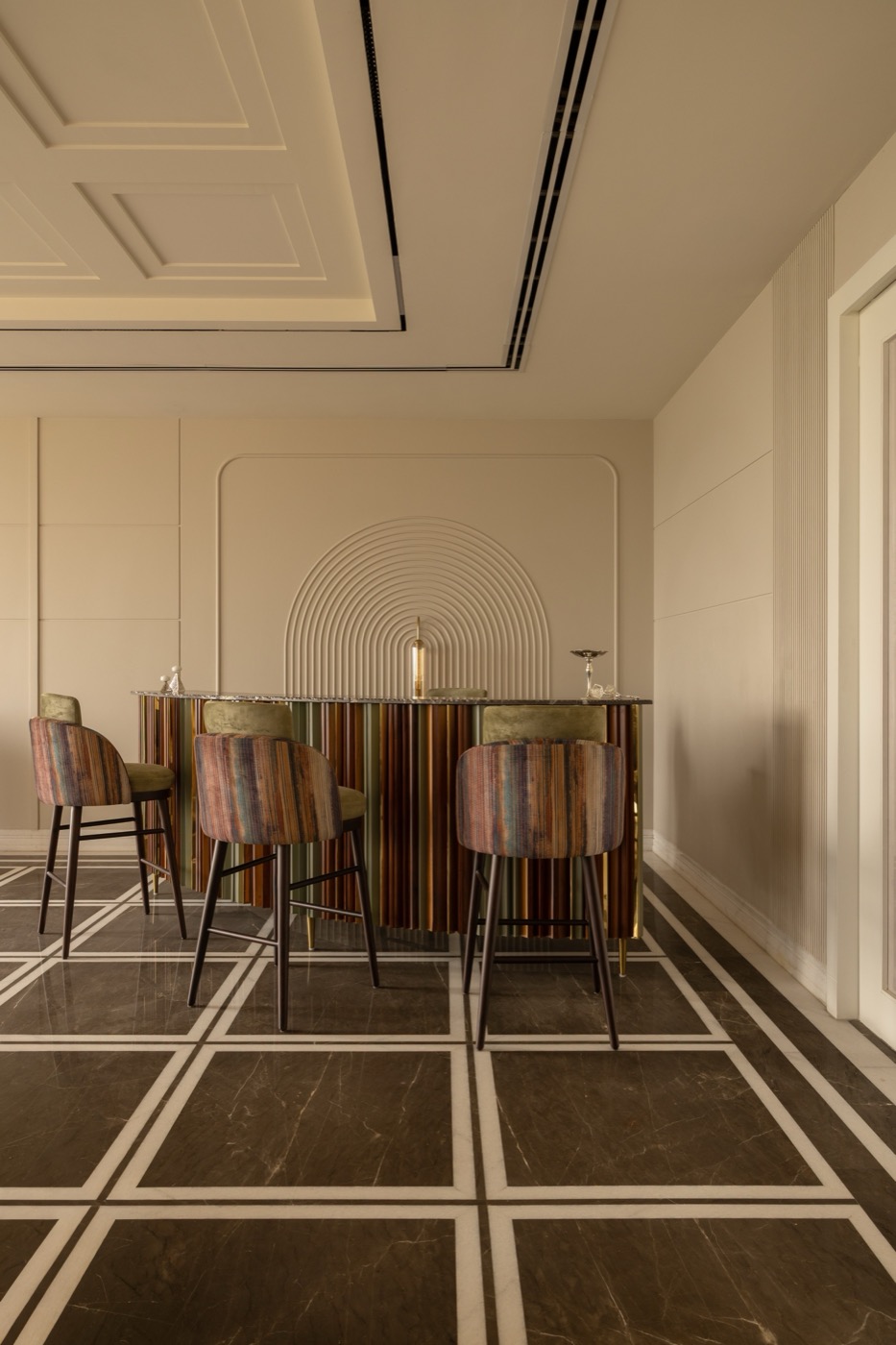 As their trusted interior designer, we managed every facet—premium flooring, intricate ceiling designs, bespoke wall finishes, custom furniture, so many floor inlay designs on each floor and flawless integration of every detail.
